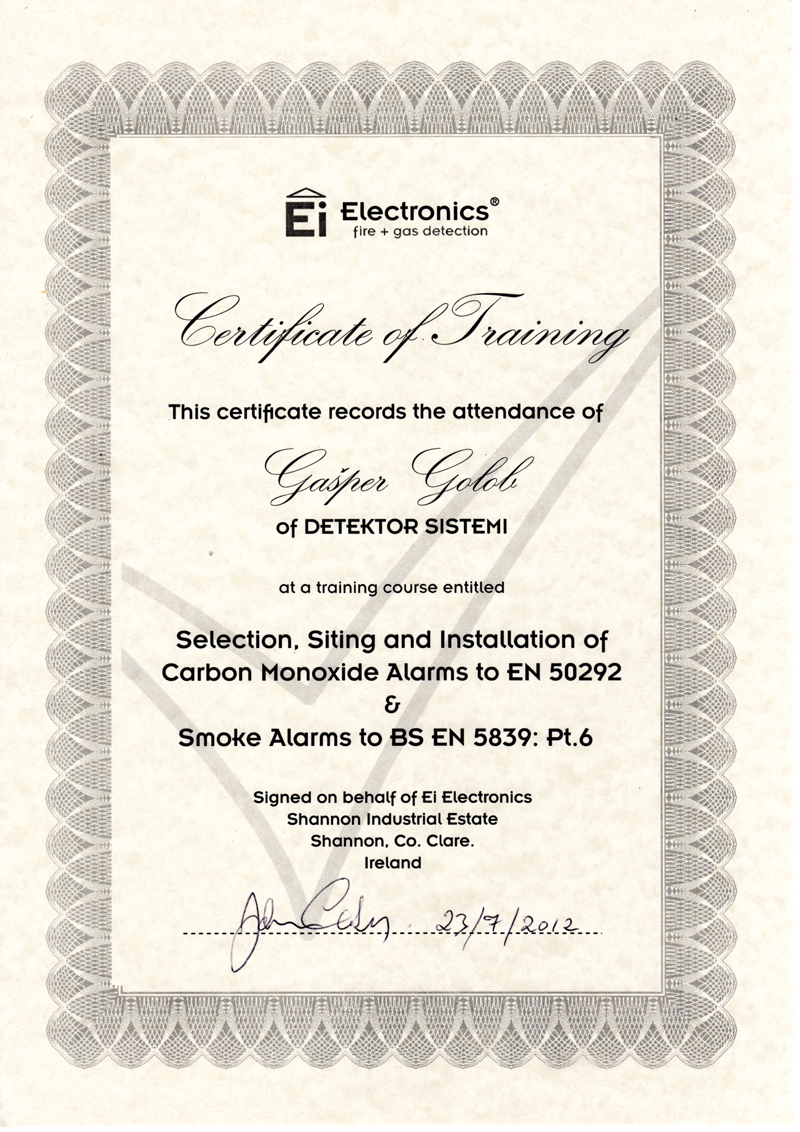 Opravili smo usposabljanje za nameščanje detektorjev ogljikovega monoksida po standardu EN 50292 ter požarnih detektorjev po standardu BS EN 5839-6. Za nas je bilo namreč najpomembnejše to, da je celotni proizvodni proces izveden v Evropi ter hkrati tudi kontroliran s strani akreditiranega certifikacijskega organa BSI Kitemark, ki 2x letno pregleda proizvodnjo in izvaja preverjanje skladnosti z zahtevami standardov EN 50291-1 in EN 50291-2.